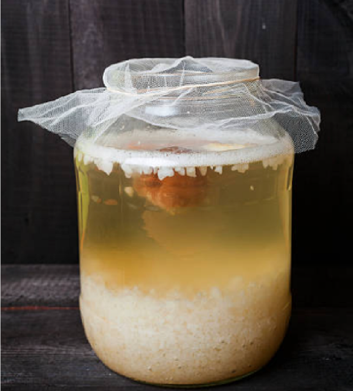 Παρασκευή ροφήματος Κομπούχα με τον μύκητα και υγρό starter. Πρώτη ζύμωση.